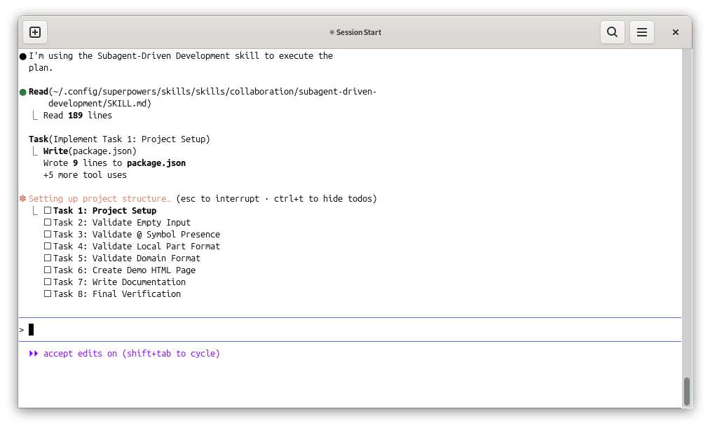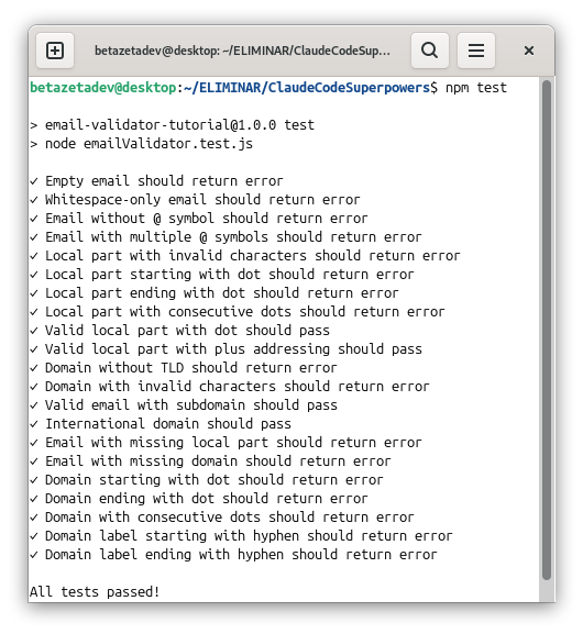 Let’s build a complete real-world example to see how Superpowers transforms your workflow. We’ll create a robust email validation system following TDD from start to finish.
