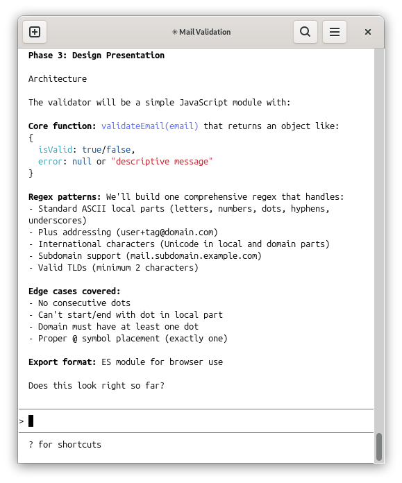 command to refine the design. Claude will start a guided conversation asking what we want to build. In this case, you would describe that you need a robust email validator that handles edge cases like international addresses, sub-addressing with +