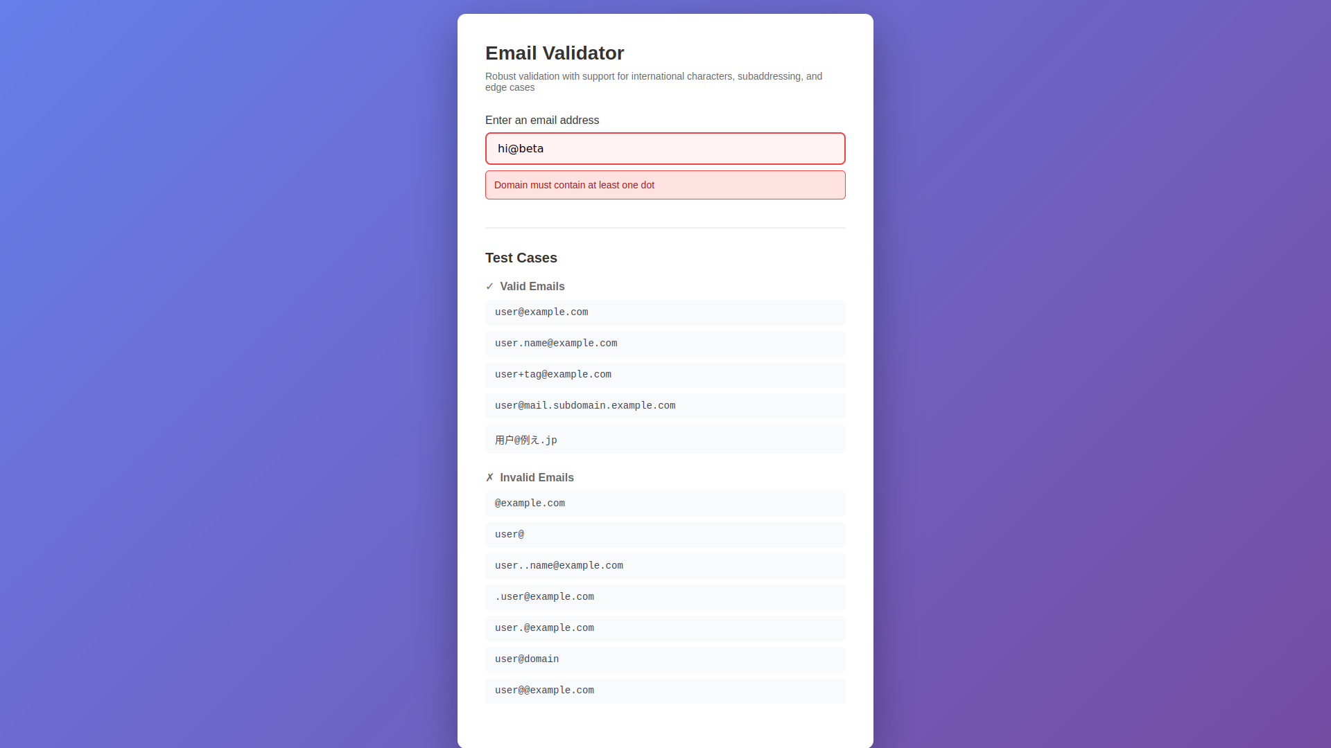 Claude will ask specific questions to understand what cases you need to handle: standard emails, emails with subdomains, valid special characters, internationalization, and rejection of invalid syntax.