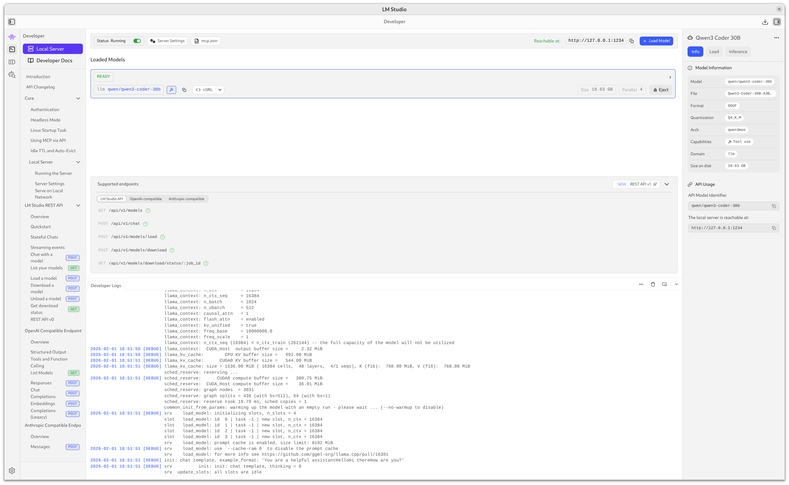 The model name must include the full path as it appears in LMStudio. For programming tasks and code generation, specialized models like Qwen 3 Coder produce better results than general-purpose models. You can verify the exact name by checking the http://localhost:1234/v1/models endpoint we tested earlier, or simply by looking at the model name in the LMStudio interface.