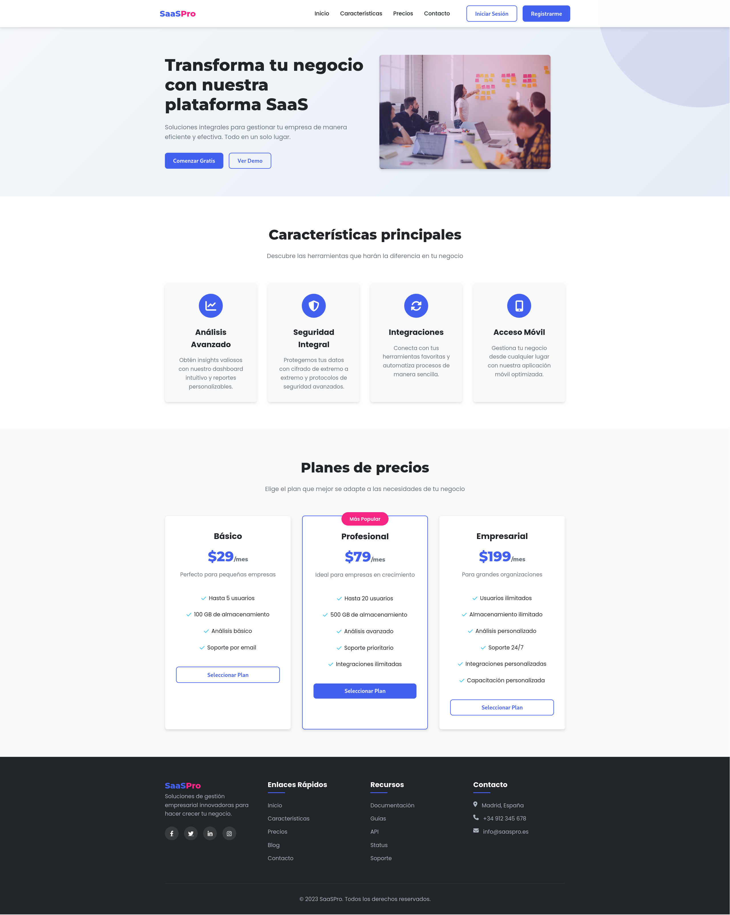 Semantic and structured HTML: The code uses appropriate tags like <section>, <nav>, <header> and <footer>, includes accessibility attributes, and has a clear structure with functional navigation, hero section with CTAs, features section with 4 features, pricing table with 3 plans (including one highlighted as “most popular”), and complete footer with links and social networks.