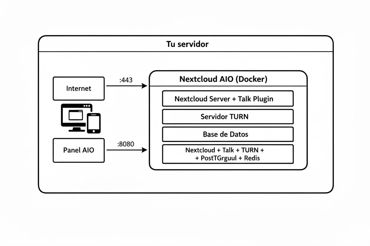 Vamos a lo concreto. Esta sección muestra cómo desplegar una instancia de Nextcloud con Talk usando Nextcloud All-in-One (AIO), el método de instalación oficial recomendado. AIO empaqueta Nextcloud junto con una base de datos PostgreSQL, caché Redis, y los componentes necesarios para que Talk funcione, incluyendo un servidor TURN integrado. Todo orquestado con Docker Compose.